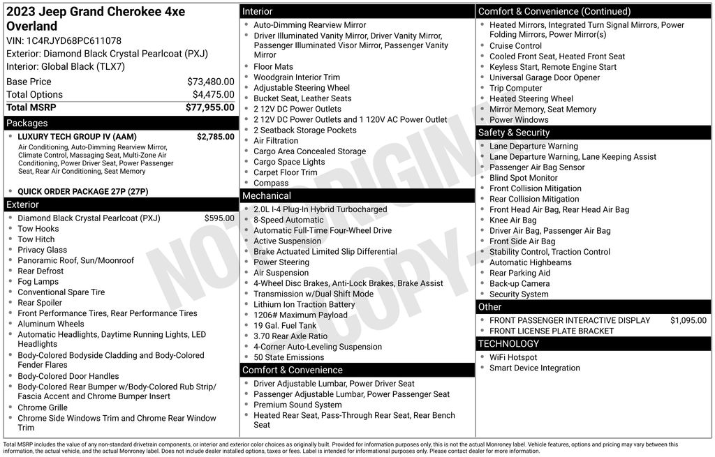 If you’re looking for A GREAT DEAL & VALUE For Your Money, then you just found it!! CALL NOW BEFORE ITS GONE!! 207-282-4101Elevate Your Driving Experience with the 2023 Jeep Grand Cherokee Overland 4xeUnlock the true potential of the open road with the exceptional 2023 Jeep Grand Cherokee Overland 4xe. This exceptional SUV is a masterpiece of engineering, blending cutting-edge technology, unparalleled comfort, and the legendary off-road capabilities that have made the Jeep brand a trusted name for generations.• Luxury Tech Group IV• Front Passenger Interactive Display• Diamond Black Crystal Pearlcoat Exterior• Navigation System• 19 Speakers• AM/FM radio: SiriusXM with 360L• Power Moonroof• Power Liftgate• Adaptive Suspension• Nappa Leather Seats• Heated and Ventilated Front Seats• Heated Rear Seats• Wireless Charging Pad• Driver and Front Passenger Power Seat Back MassageCrafted with the discerning driver in mind, the 2023 Jeep Grand Cherokee Overland 4xe is a true marvel of modern automotive engineering. Beneath its striking exterior lies a 2.0L I4 DOHC engine, delivering a seamless blend of power and efficiency that will leave you in awe. With 4-wheel drive capabilities, this SUV is ready to tackle any terrain, whether you're navigating the city streets or venturing off the beaten path.Step inside the cabin and be enveloped in a world of unparalleled luxury and comfort. The Nappa leather-trimmed seats offer a level of sophistication that will make every journey a true pleasure, while the heated and ventilated front seats and heated rear seats ensure you and your passengers stay cocooned in comfort, no matter the weather. The Luxury Tech Group IV takes the driving experience to new heights, with features like the ATC with 4-zone temperature control, the Front Passenger Interactive Display, and the Wireless Charging Pad, keeping you connected and in control.The 2023 Jeep Grand Cherokee Overland 4xe is more than just a vehicle – it's a statement of your discerning taste and your commitment to the ultimate driving experience. With its stunning Diamond Black Crystal Pearlcoat exterior and 20-inch machined face aluminum wheels, this SUV commands attention wherever it goes, turning heads and leaving a lasting impression.But the true magic of the Overland 4xe lies in its exceptional performance. The 2.0L I4 DOHC engine, paired with an 8-speed automatic transmission, delivers a seamless and responsive driving experience, while the 4-wheel drive system ensures you can conquer any terrain with confidence.Elevate your driving experience and make a bold statement with the 2023 Jeep Grand Cherokee Overland 4xe. This exceptional SUV is the perfect blend of luxury, technology, and off-road prowess, ready to take you on the adventure of a lifetime. Visit our showroom today and experience the difference for yourself.