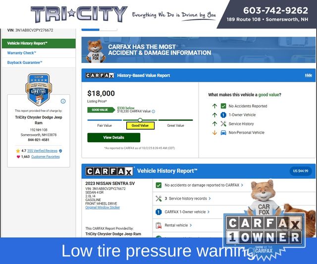 Fully serviced & Ready To Drive Home Today CALL NOW BEFORE ITS GONE!! (603) 207-8583Brakes checkedCabin air filter replaced/cleanedDrivability/performance checkedOil and filter changedTire(s) balancedTires rotatedDiscover the perfect blend of style, technology, and efficiency with this stunning 2023 Nissan Sentra SV. This sleek and modern sedan is designed to elevate your driving experience, offering a remarkable combination of features that cater to your every need.• Carpeted Floor Mats w/Trunk Mat• AM/FM radio: SiriusXM• Radio: AM/FM w/RDS/MP3/Aux-In• Air Conditioning• Rear window defroster• Remote keyless entry• Steering wheel mounted audio controls• Traction control• 4-Wheel Disc Brakes• Low tire pressure warning• Blind Spot Warning• Brake assist• Electronic Stability Control• Rear Parking SensorsSlip behind the wheel of this 2023 Nissan Sentra SV and experience the perfect blend of style and performance. With its sleek exterior design and well-appointed interior, this sedan is sure to turn heads wherever you go. The 2.0L DOHC engine, paired with the efficient CVT with Xtronic transmission, delivers an impressive 29 city/39 highway MPG, ensuring you can go further on every tank of gas.But it's not just the power and efficiency that make this Sentra SV stand out. The advanced technology features, including NissanConnect with Apple CarPlay and Android Auto, keep you connected and entertained on the go. The Blind Spot Warning and Rear Parking Sensors provide added peace of mind, while the Tilt and Telescoping Steering Wheel allow you to find the perfect driving position.Safety is also a top priority in the Sentra SV, with a comprehensive suite of advanced safety features. From the Dual Front Impact Airbags and Dual Front Side Impact Airbags to the Electronic Stability Control and Brake Assist, you can rest assured that you and your passengers are well-protected.But the true beauty of this Sentra SV lies in its versatility. Whether you're commuting to work, running errands, or embarking on a road trip, this sedan adapts to your lifestyle with ease. The spacious interior and split-folding rear seats provide ample room for passengers and cargo, ensuring that you can take everything you need with you.Don't miss your chance to experience the exceptional 2023 Nissan Sentra SV. Visit our showroom today and let our knowledgeable sales team guide you through all the features and benefits this remarkable vehicle has to offer. We're confident that once you take it for a test drive, you'll be convinced that this is the perfect car for you.