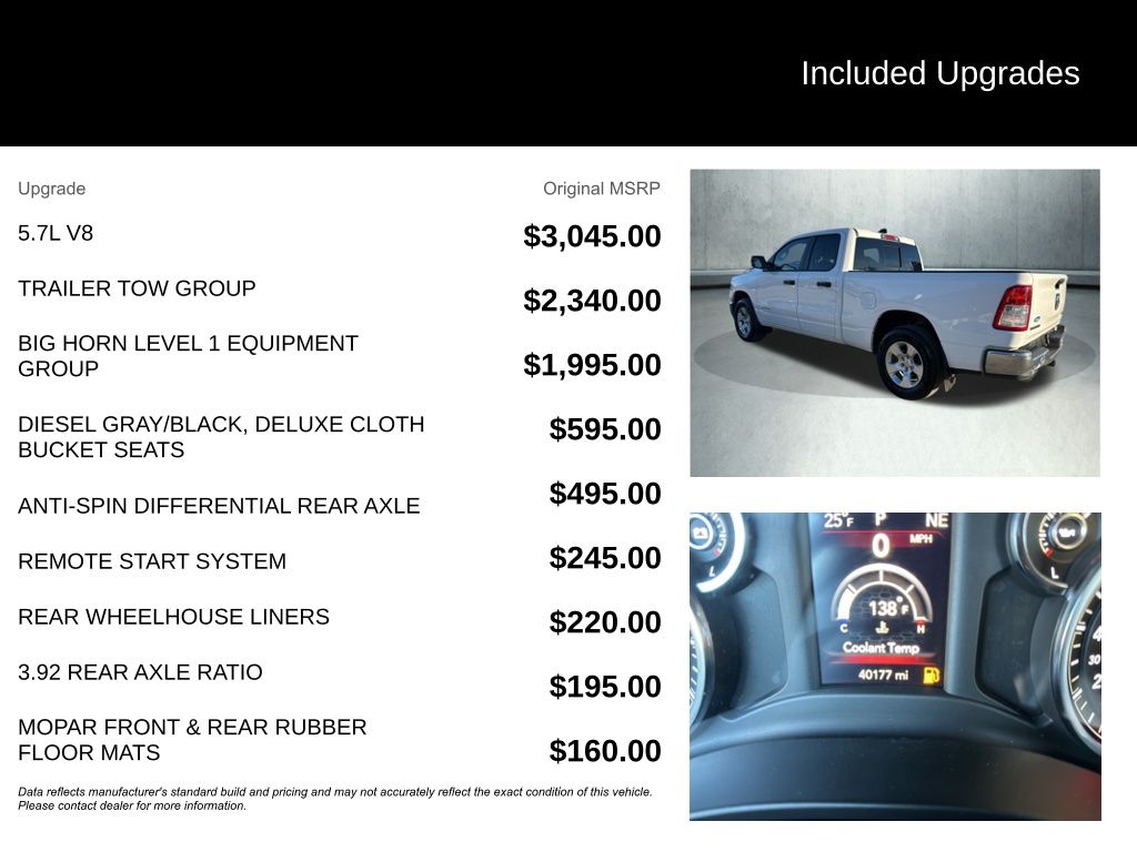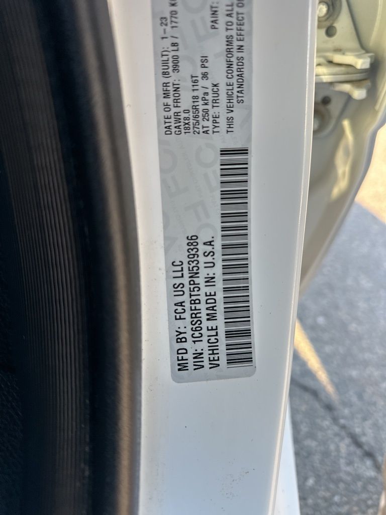 2023 Ram 1500 Big Horn/Lone Star 3.92 Rear Axle Ratio, 4G LTE Wi-Fi Hot Spot, 8.4" Touchscreen Display, Anti-Spin Differential Rear Axle, Apple CarPlay, Auto-Dimming Exterior Driver Mirror, Auto-Dimming Rear-View Mirror, Big Horn Level 1 Equipment Group, Black Trailer Tow Power Mirrors, Bluetooth Handsfree Phone & Audio, Brake assist, Class IV Receiver Hitch, Delay-off headlights, Electric Shift-On-Demand Transfer Case, Electronic Stability Control, Exterior Mirrors w/Heating Element, Front Fog Lamps, Fully automatic headlights, Google Android Auto, Heated door mirrors, Heated Front Seats, Heated Steering Wheel, ParkView Rear Back-Up Camera, Power-Folding Mirrors, Quick Order Package 27Z Big Horn, Radio: Uconnect 5 W w/8.4" Display, Rear Power Sliding Window, Rear Window Defroster, SiriusXM Satellite Radio, Trailer Brake Control, Trailer Light Check, Trailer Reverse Steering Control, Trailer Tire Pressure Monitoring System, Trailer Tow Group, Trailer Tow Mirrors, Wheels: 18" x 8" Cast-Aluminum Painted. CARFAX One-Owner. Clean CARFAX.