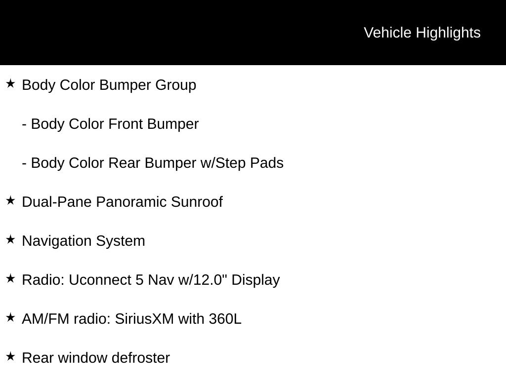 The Uconnect 5 Nav system with its 12-inch display puts a wealth of information and entertainment at your fingertips. Seamlessly integrate your smartphone with Apple CarPlay and Android Auto, and enjoy your favorite music, podcasts, and navigation with ease.