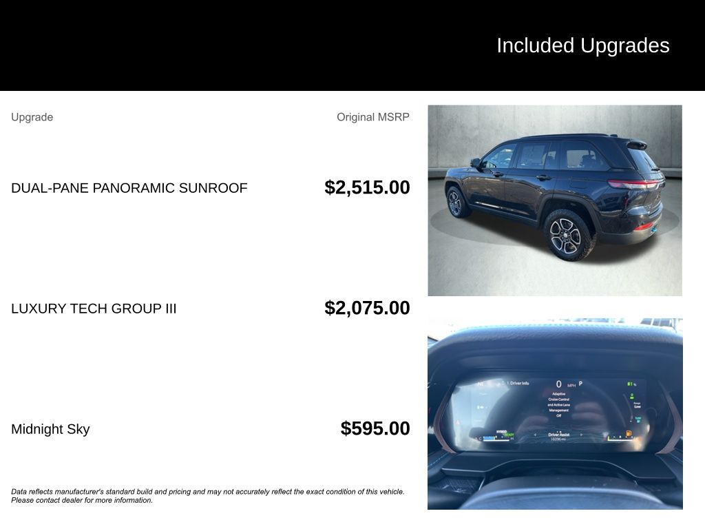 Powered by a 2.0L I4 DOHC engine, the Trailhawk 4xe delivers impressive performance and efficiency, thanks to its 8-Speed Automatic transmission and 4WD capabilities. This SUV is not only a joy to drive but also a responsible choice, with its advanced hybrid powertrain that seamlessly blends electric and gasoline power for a truly remarkable driving experience.