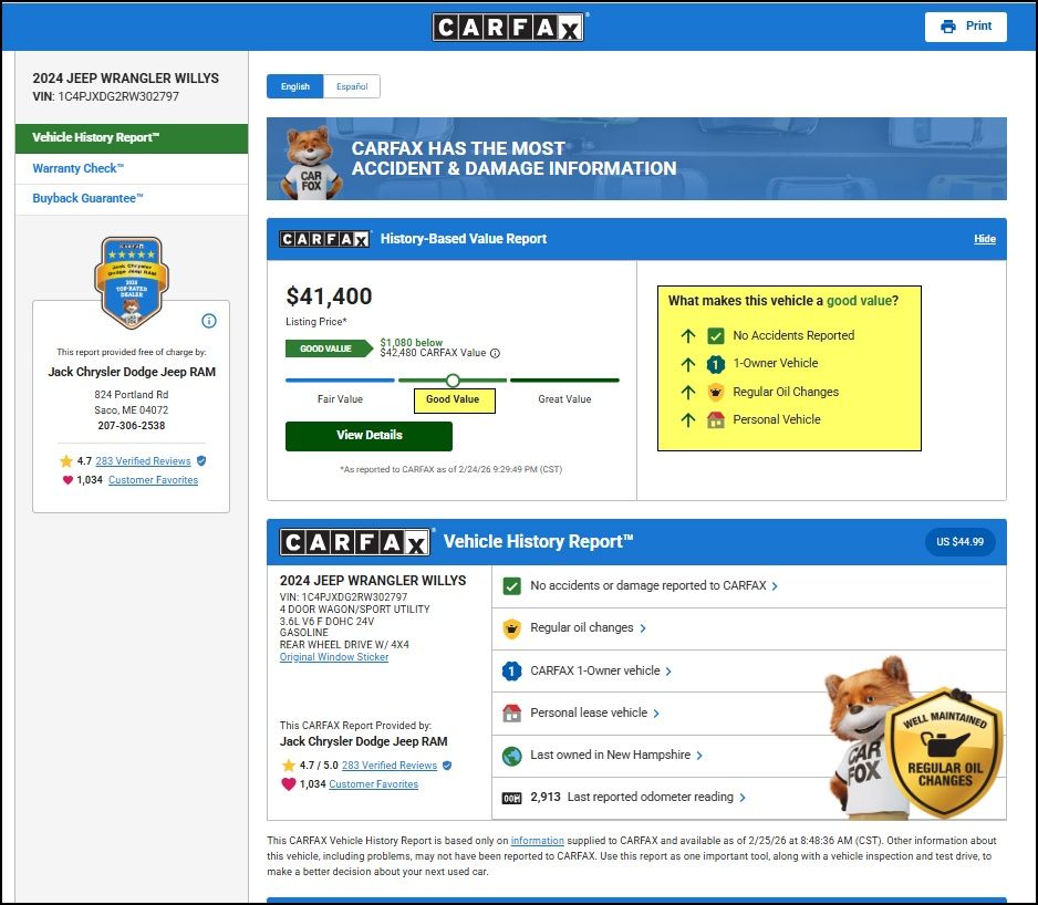 Powered by a robust 3.6L V6 engine mated to an 8-speed automatic transmission ($4500.00 VALUE), the Wrangler Willys delivers impressive performance and exceptional 4WD capability. Conquer the toughest terrain with features like the Dana M210 Wide HD Tube Front Axle, Dana M220 Wide Rear Axle, and E-Locker Rear Axle. The Corning Gorilla Glass and Molded in Color Rubicon Highline Flare add both durability and style to this rugged SUV.