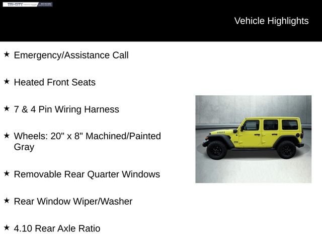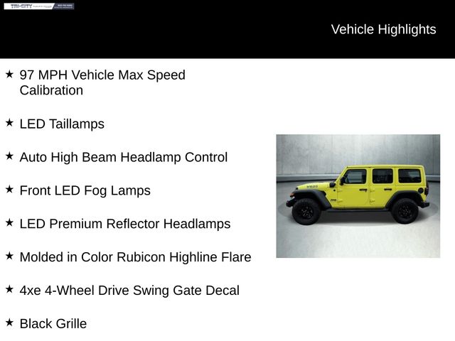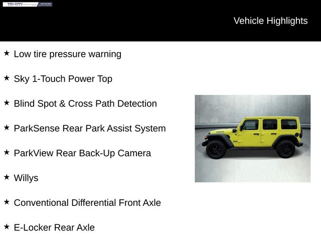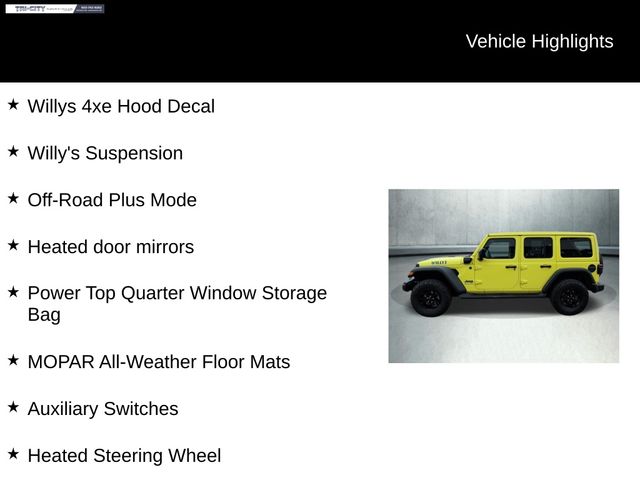 Designed for the adventurous soul, the Wrangler Willys 4xe offers unparalleled off-road capabilities. With features like the E-Locker Rear Axle, Off-Road Plus Mode, and Molded in Color Rubicon Highline Flare, this Jeep is ready to tackle any terrain with confidence.
