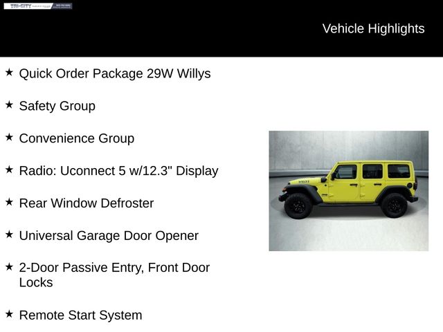 Beneath its rugged exterior, this Wrangler Willys 4xe is powered by a 2.0L I4 DOHC engine, delivering exceptional performance and efficiency. The 8-speed automatic transmission and 4-wheel drive system ensure seamless handling, whether you're navigating the city streets or conquering the great outdoors.