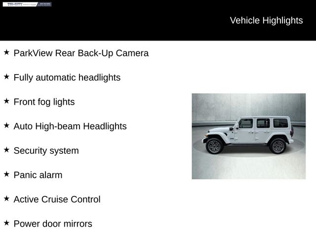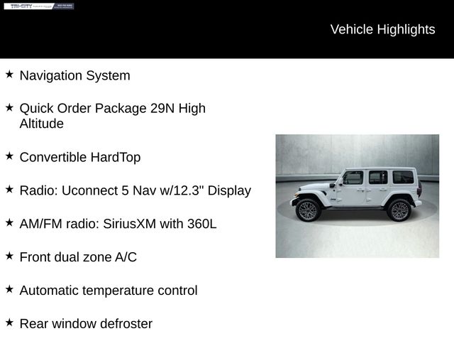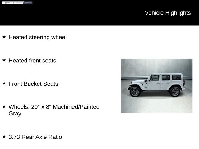 Powered by a 2.0L I4 DOHC engine and 8-speed automatic transmission, this Wrangler High Altitude 4xe delivers exceptional performance and capability. With its 4WD system and advanced off-road features, you'll conquer any terrain with confidence. And with the added efficiency of the 4xe hybrid powertrain, you'll enjoy the perfect blend of power and fuel economy.