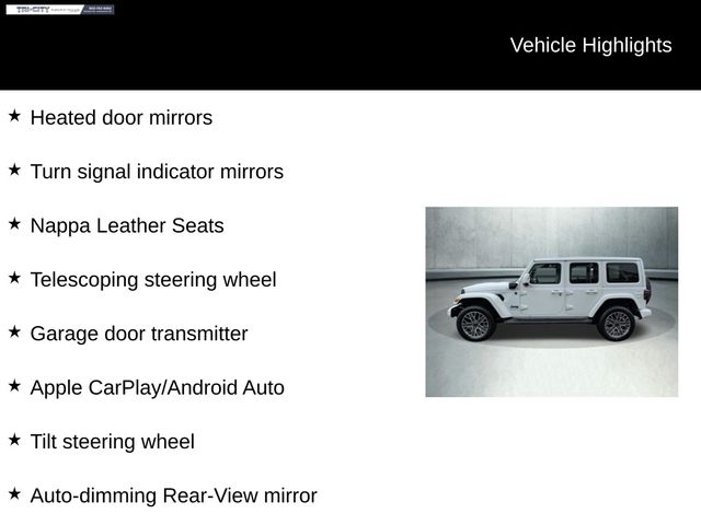 Step inside and experience the epitome of luxury and technology. The Wrangler High Altitude 4xe boasts a stunning Nappa Leather-wrapped interior, heated front seats, a heated steering wheel, and a state-of-the-art Uconnect 5 infotainment system with a 12.3-inch display. Stay connected with Apple CarPlay and Android Auto, while the Active Cruise Control and advanced safety features keep you secure on the road.