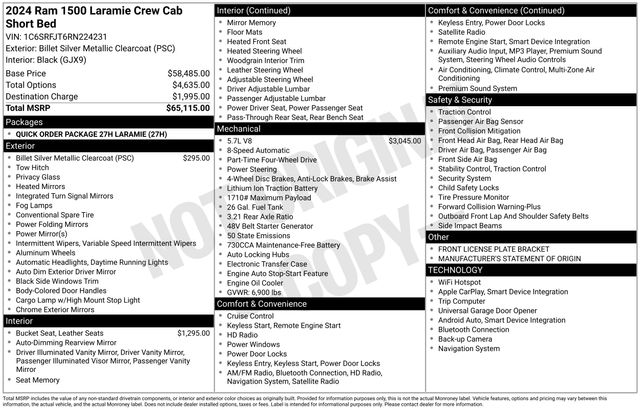 Discover the power and luxury of the 2024 Ram 1500 Laramie CREW CAB. This stunning silver truck is equipped with a HEMI 5.7L V8 engine, delivering exceptional performance and efficiency with 18 city and 22 highway MPG. Boasting an impressive array of premium features, this Ram 1500 is designed to elevate your driving experience.