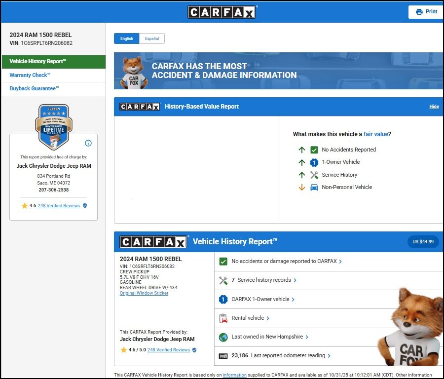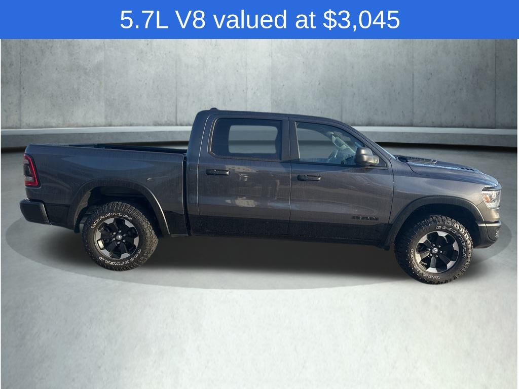 2024 Ram 1500 Rebel 3.92 Rear Axle Ratio, 4-Wheel Disc Brakes, 4G LTE Wi-Fi Hot Spot, Apple CarPlay/Android Auto, Auto-dimming Rear-View mirror, Automatic temperature control, Brake assist, Connected Travel & Traffic Services, Convex Wide-Angle Exterior Mirror Insert, Delay-off headlights, Electronic Stability Control, Emergency communication system: RAM Connect, Exterior Mirrors w/Heating Element, Front dual zone A/C, Front fog lights, Full Length Upgraded Floor Console, Fully automatic headlights, GPS Navigation, HD Radio, Instrument Cluster Theme 2 - Rebel, Integrated Voice Command w/Bluetooth, Low tire pressure warning, Navigation System, Off-Road Information Pages, ParkView Rear Back-Up Camera, Power door mirrors, Radio: Uconnect 5 Nav w/8.4" Display, Remote keyless entry, SiriusXM Radio Service, Speed control, Steering wheel mounted audio controls, Telescoping steering wheel, Tilt steering wheel, Traction control, USB Host Flip, Wheels: 18" x 8.0" Painted Mid-Gloss Black. CARFAX One-Owner. Clean CARFAX.
