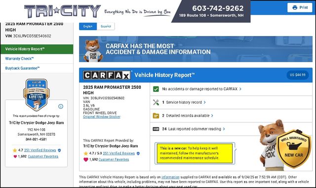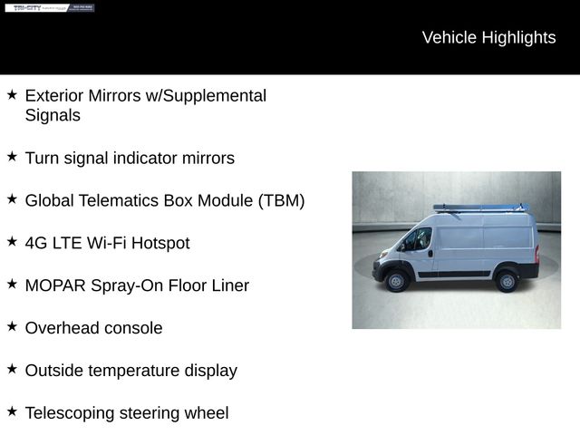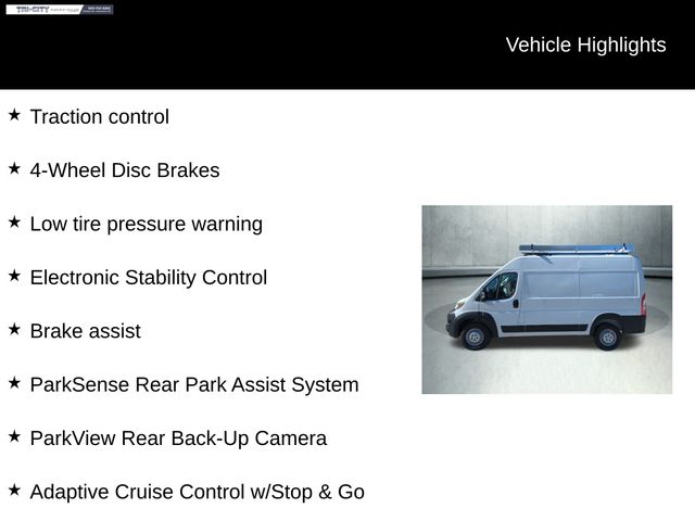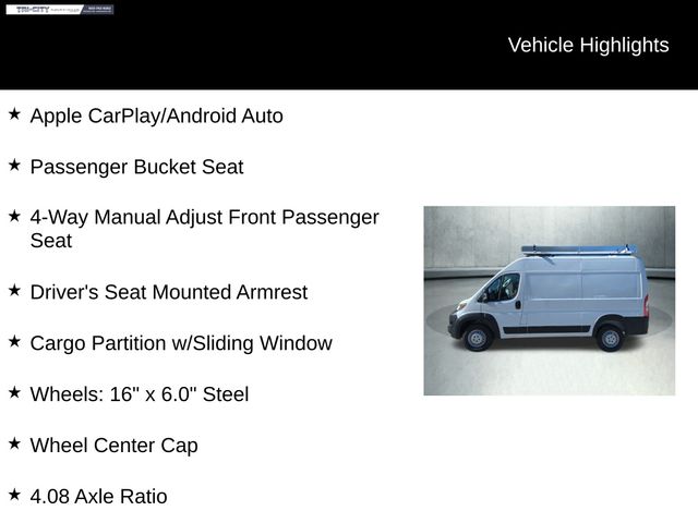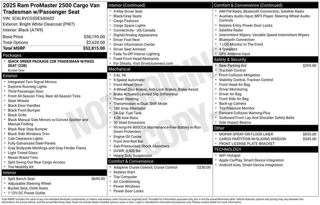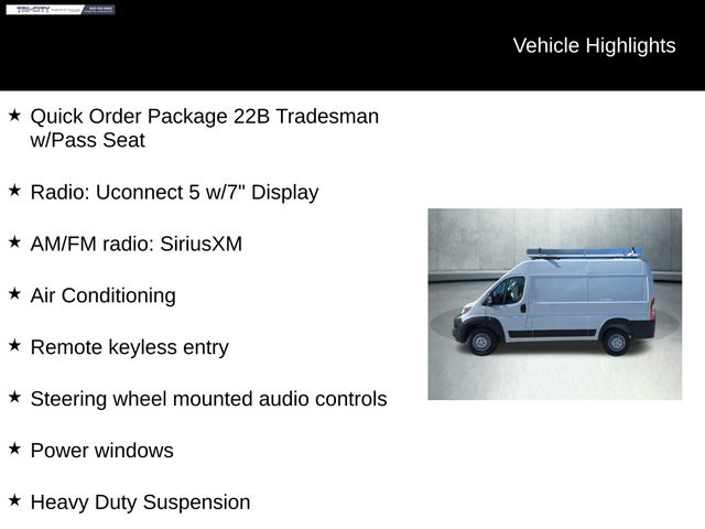 Discover the ultimate in versatility and efficiency with the 2025 Ram ProMaster 2500 High Roof. This exceptional work van is designed to handle all your business needs, from hauling heavy cargo to navigating tight city streets. $54,910 MSRP!!!!Packed with an impressive array of features, this ProMaster stands out from the crowd. Key highlights include:Tradesman Package 22BPassenger Double Seat $695 Customer Value!!Tradesman Package 22BPassenger Double Seat $695 Value!!Adaptive Cruise Control with Stop and Go $230 Value!!ParkSense® Rear Park–Assist System $295 Value!!Cargo Partition with Sliding Window $545 Value!!Spray–On Floor Liner by Mopar® $855 Value!!Adaptive Cruise Control with Stop and Go $230 Value!!ParkSense® Rear Park–Assist System $295 Value!!Cargo Partition with Sliding Window $545 Value!!Spray–On Floor Liner by Mopar® $855 Customer Value!!The ProMaster's powerful 3.6L V6 engine and 9-speed automatic transmission deliver the performance you need, while the front-wheel-drive configuration ensures exceptional maneuverability. With its spacious High Roof design, this van offers ample headroom and cargo capacity, making it the perfect partner for your business.Beyond its impressive capabilities, the ProMaster also boasts a host of advanced technologies to keep you connected and in control. Enjoy the convenience of the Uconnect 5 infotainment system with a 7-inch display, Apple CarPlay, and Android Auto integration. Stay safe with features like the ParkView Rear Back-Up Camera and Adaptive Cruise Control with Stop & Go.The ProMaster's rugged construction and heavy-duty suspension ensure a smooth and reliable ride, no matter the terrain. And with the Quick Order Package 22B Tradesman with Passenger Seat, you'll have all the essential amenities to keep your team comfortable and productive on the job.At our dealership, we understand that your business is unique, and that's why we're committed to providing you with the perfect vehicle to meet your needs. The 2025 Ram ProMaster 2500 High Roof is more than just a work van – it's a versatile, efficient, and technologically advanced solution that can help take your business to new heights.Experience the difference for yourself. Visit our showroom today and let us demonstrate how the ProMaster can transform the way you work. We're confident that once you see and feel the power of this remarkable van, you'll be ready to drive away in the perfect partner for your business.