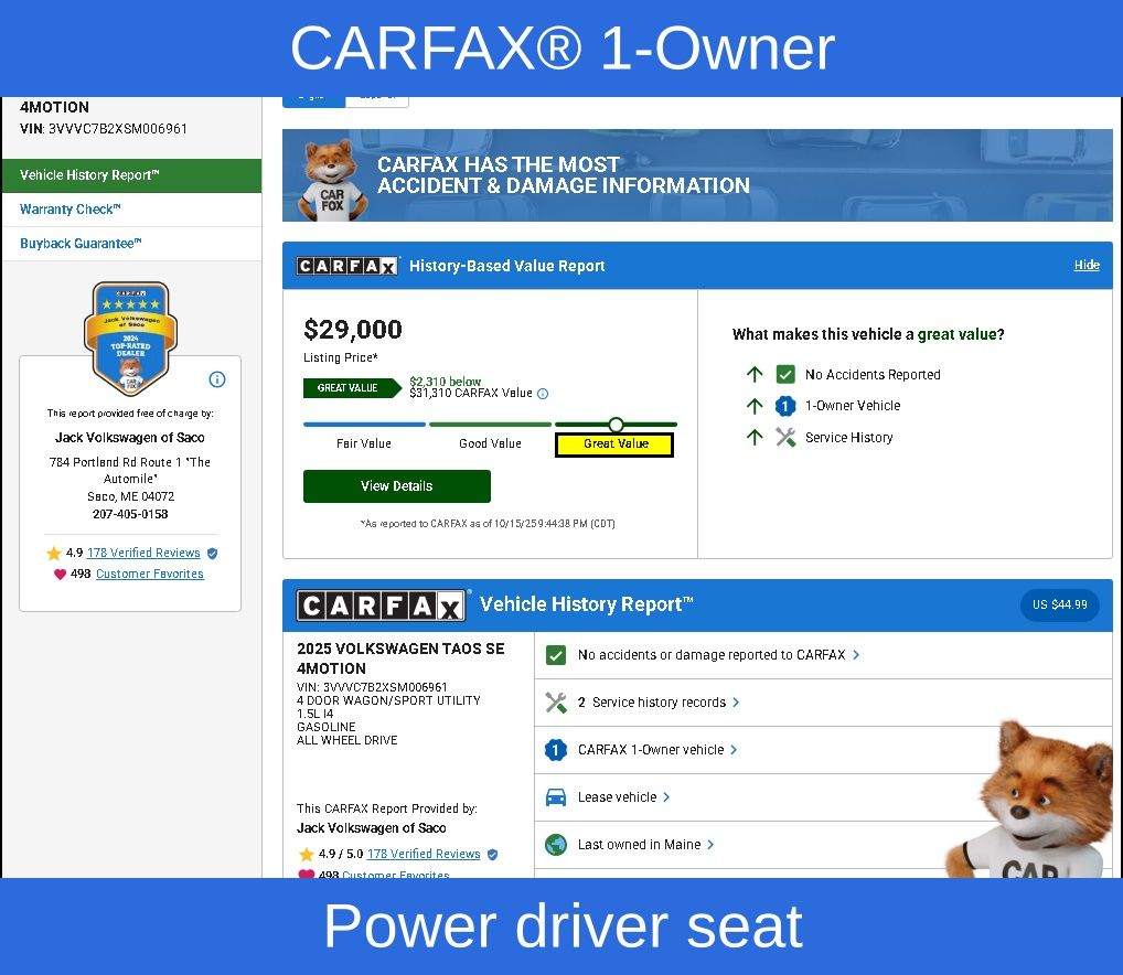 Experience the exceptional 2025 Volkswagen Taos 1.5T SE for yourself. Visit our showroom today and let our knowledgeable team guide you through all the features and capabilities of this remarkable compact SUV. We're confident you'll be captivated by its winning combination of style, performance, and cutting-edge technology. Don't miss your opportunity to make the Taos 1.5T SE your next automotive companion.